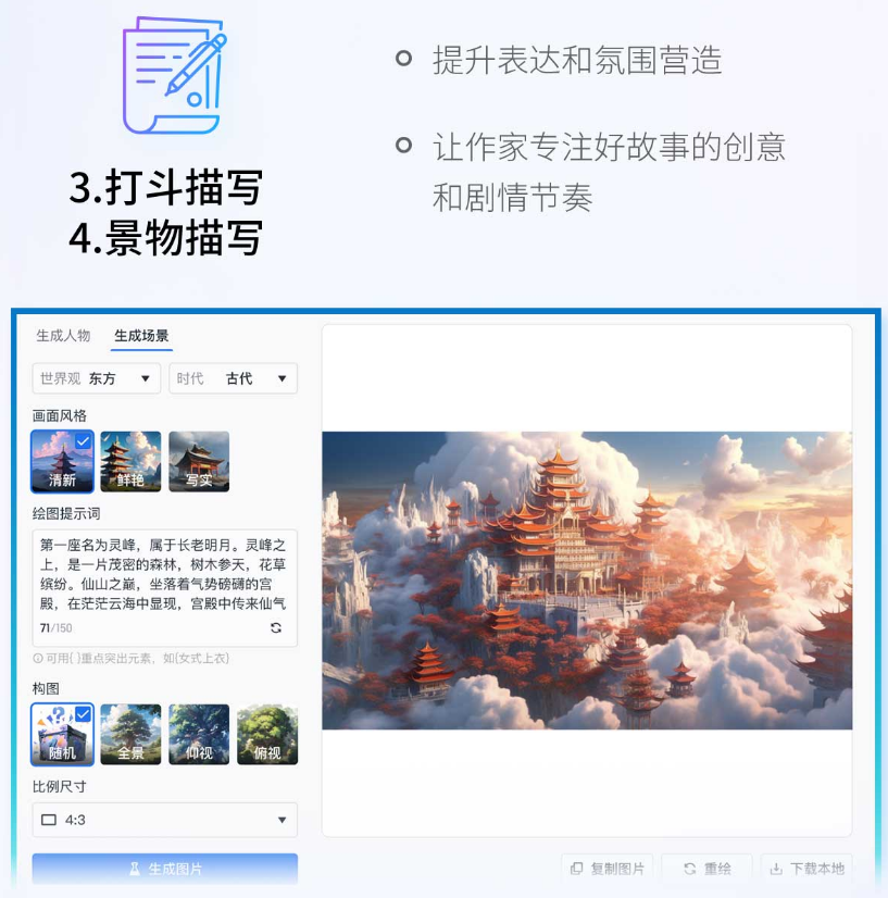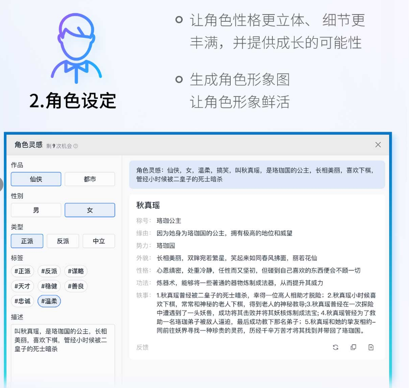黄琰仔细讲解了“作家助手妙笔版”的四大功能:世界观设定、角色设定、情景描写和打斗描写,举例展示了这些功能如何帮助作家丰富细节、辅助创作、提升效率等。比如,世界观设定是网文创作前期筹备的重要内容之一,涉及武力值、地图、门派势力等多重细节,“作家助手妙笔版”的世界观设定功能,能为作家丰满世界观设定,生成大段内容补充,并完善细节。但世界观的精神内核、演化走向,仍需作家自己把握。