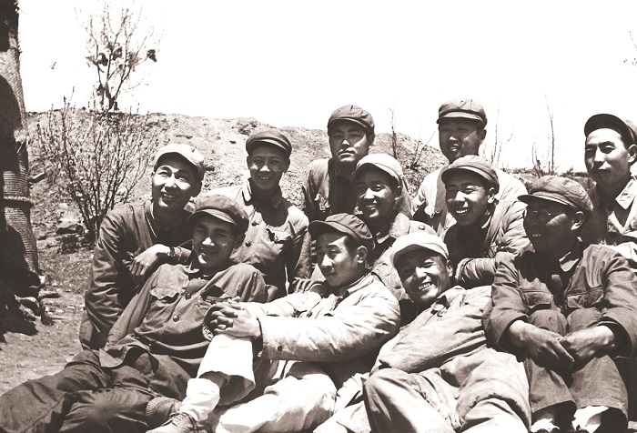 1953年,黄谷柳(左一)与志愿军战士合影留念