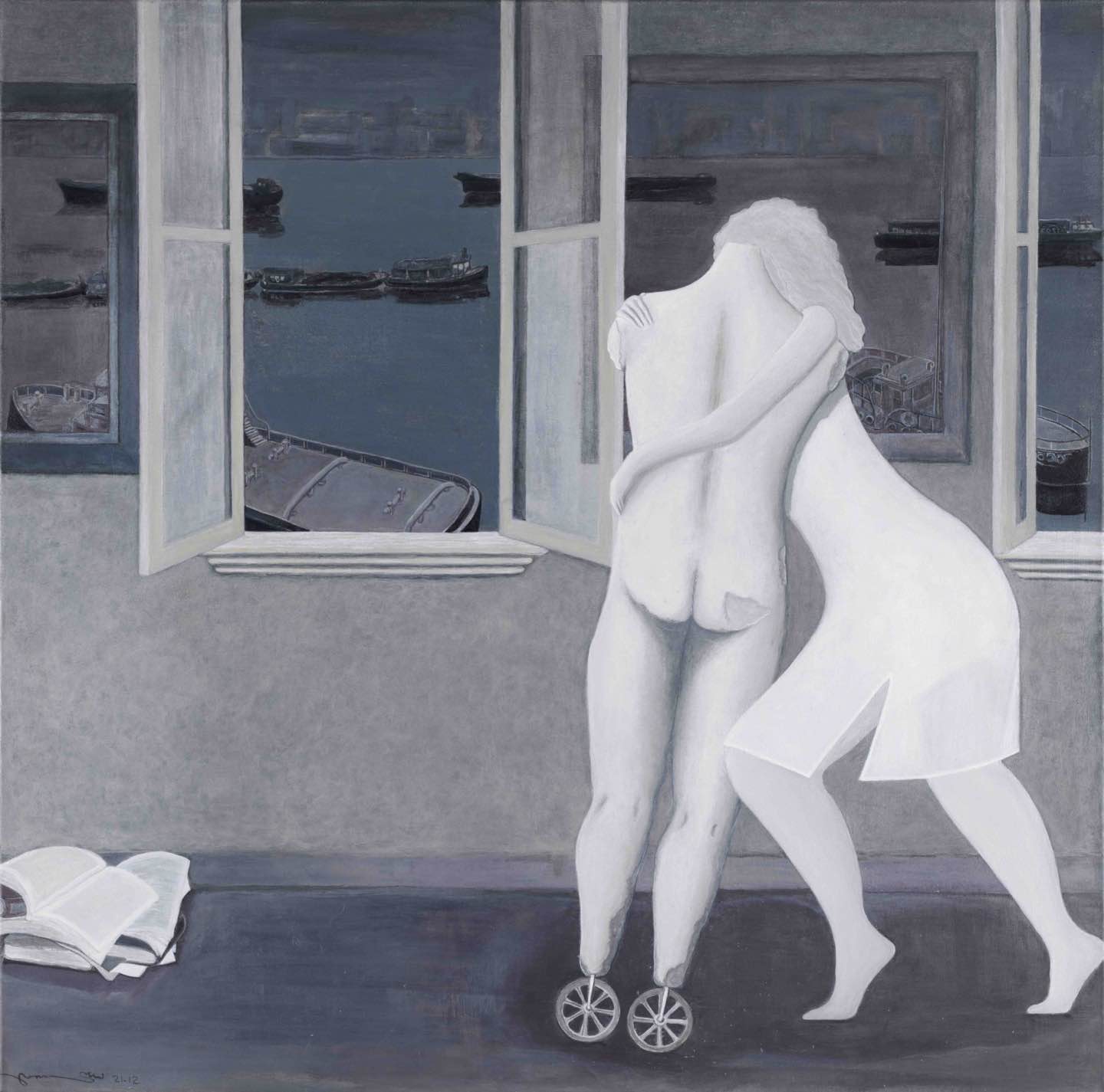 《舞蹈》系列是展览里为数不多的带有透视景观也带有着人像描绘的作品,画面里女人胴体的绘画手法与展览里的《螺纹》《伤痕》《舞蹈》里同样素材是类似的,让人想起了上个世纪的旅法艺术家常玉的一些人物绘画。而《舞蹈》(右)里占据画面上半部分的江景描绘,金宇澄使用了20世纪中期的一些上海画派的风景绘画艺术家的创作手法。