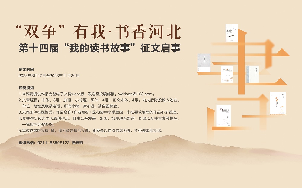 为推动全民阅读,营造“双争”有我·书香河北浓厚氛围,河北省作家协会、河北日报报业集团联合举办第十四届“我的读书故事”征文活动。愿读书滋养智慧心灵,开启人生梦想,点亮美好生活,请您拿起笔来,写下独属于您的读书故事。