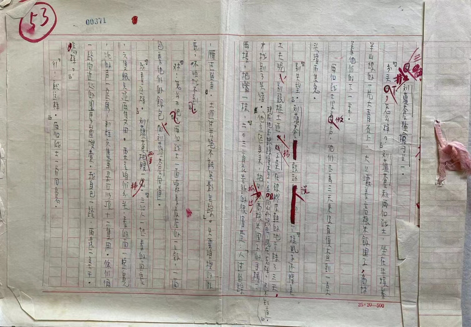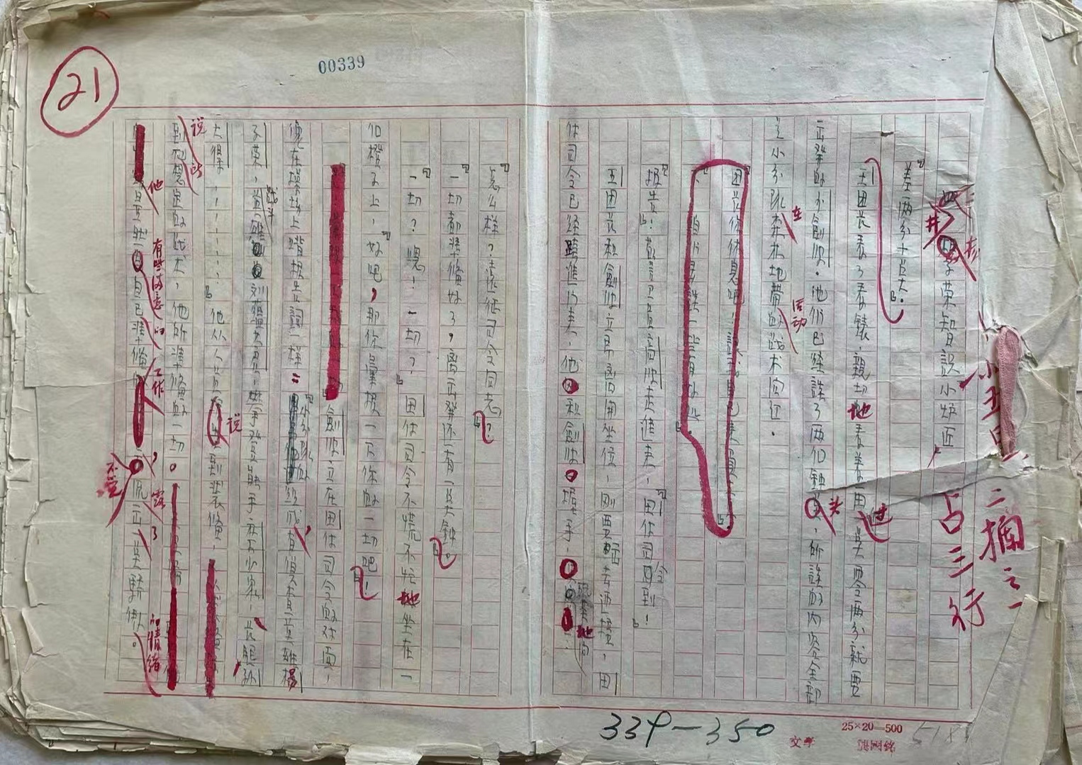 该稿第一页正中间贴有一张“杂志发稿簽”(76mm×100mm),稿簽写有“人民文学 1957年 第2期 第18篇 共118页 计50000字”。全稿总计98页,五个部分,每个部分均被粉色小布条在右边整齐地装订好。作者、抄稿人均用蓝黑钢笔从右往左书写在25×20=500的竖格稿纸上( 357mm×250mm),每页手稿都有多处编辑用红笔修改、删除的地方。每页稿纸左上方分别有红色和蓝黑色标注的不同序号,红色序号为1-98,蓝黑色序号为00319-00416,这应该是编辑使用了两种统计方式来标注页码。
