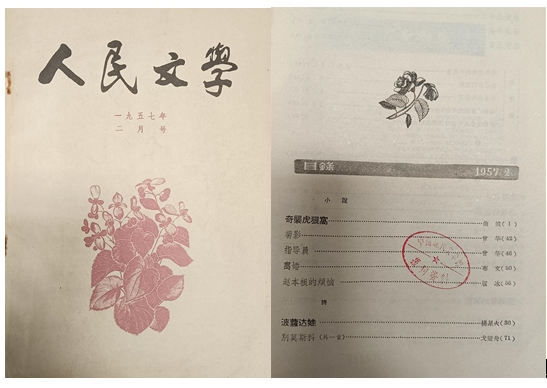 通过查阅资料,我发现这部手稿的章节与1957年2月《人民文学》杂志社刊登的《林海雪原》节选章节完全一致,只是很可惜缺少了《破天险奇袭奶头山》这一章。原来在筹划出版期间,人民文学出版社将该稿推荐给了《人民文学》杂志社。时任《人民文学》副主编秦兆阳看到书稿后连夜审读,同样他也被小说故事所深深吸引,“看到困得一个字也看不了了,才睡”。1957年2月,《人民文学》以《奇袭虎狼窝》为题,从《林海雪原》中选载了全书中的第三、四、五、六、七、八章,即《受命》《杨子荣智识小炉匠》《刘勋苍猛擒刁占一》《夜审》《蘑菇老人神话奶头山》《破天险奇袭奶头山》。他们认为这六章“在全书中自称段落,恰似一个完整的中篇;”。刊登时,秦兆阳亲自撰写按语,向读者热情地介绍这部小说。在按语中,秦兆阳认为《林海雪原》的出版“将是我国文学创作上的一个可喜的收获”。