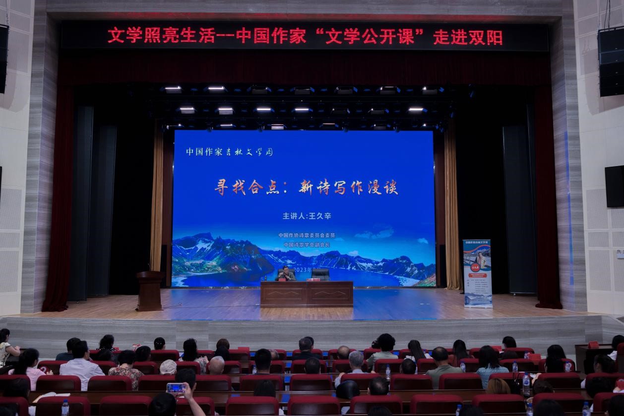 在长春双阳区委党校大教室,王久辛以“寻找合点:新诗写作漫谈”为题,结合个人创作经历,向现场的文学爱好者们阐释了新诗创作如何寻找“合点”、怎样就“合点”写出有爆发力的好作品等话题,并分享了自己在诗歌创作中的感悟和体会。他以自己创作长诗《朱凡》《大地夯歌》《零刻度》《肉搏的大雨》《初恋杜鹃》时的创作历程为切入点,指导大家在诗歌创作中要注重“写境”和“造境”,并把修辞和逻辑作为诗歌创作的基本功。大家就诗歌的创作要求、评判标准以及诗歌的时代责任与担当等问题提问,王久辛一一给予解答,并鼓励文学爱好者们要立足本土文学,坚定文化自信,创作出具有地域特色、彰显文化担当的佳作。