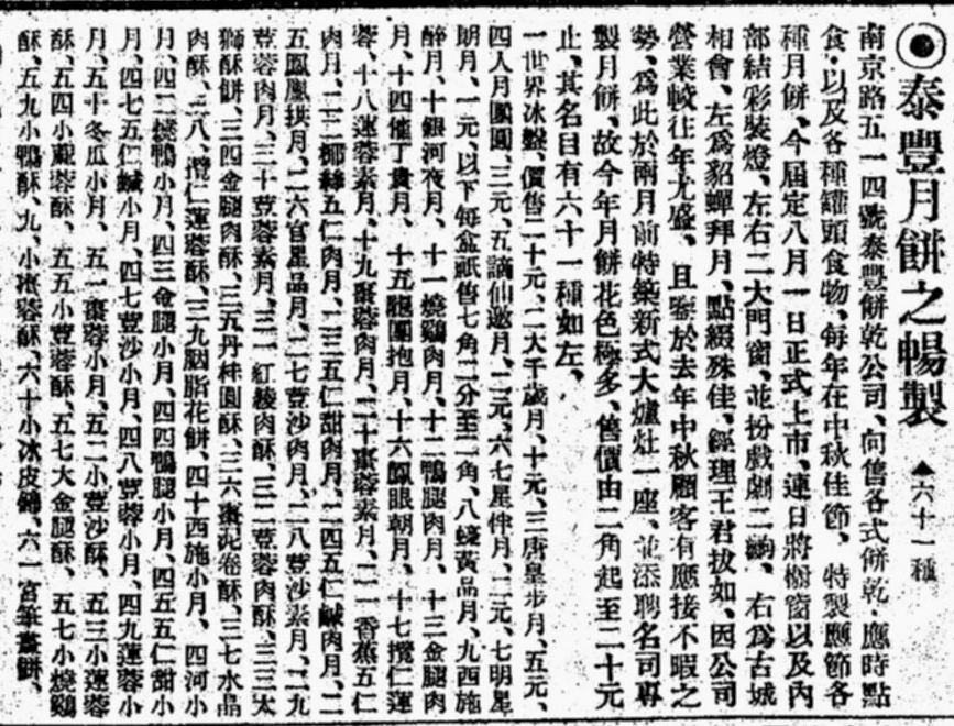 南京路五一四号泰丰饼干公司,向售各式饼干,应时点食,以及各种罐头食物,每年在中秋佳节,特制应节各种月饼,今届定八月一日正式上市,连日将櫉窗以及内部结彩装灯,左右二大门窗并扮戏剧二出,右为古城相会,左为貂蝉拜月,点缀殊佳。经理王君拔如因公司营业较往年尤盛,且鉴于去年中秋顾客有应接不暇之势,为此于两月前特筑新式大炉灶一座,并添聘名司,专制月饼,故今年月饼花色极多,售价由二角起至二十元止,其名目有六十一种(统计标号有误,事实上有六十二种)如左: