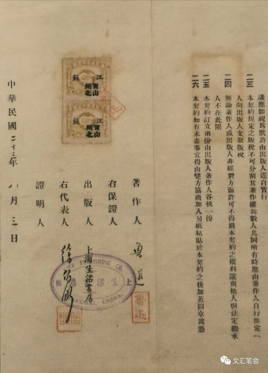 合同最后一面有著作人鲁迅的亲笔签名,钤阳文“鲁迅”印;又钤有出版人“上海生活书店”的椭圆形蓝印公章,以及生活书店代表人徐伯昕的亲笔签名,并钤阳文“伯昕”印;在“民政局印花税票”上又钤阳文“鲁迅”印,极为郑重其事,合同签署日期填写的是“二十三年八月三日”。可见这是一份正式的手续完备的鲁迅译著《小约翰》的出版合同。