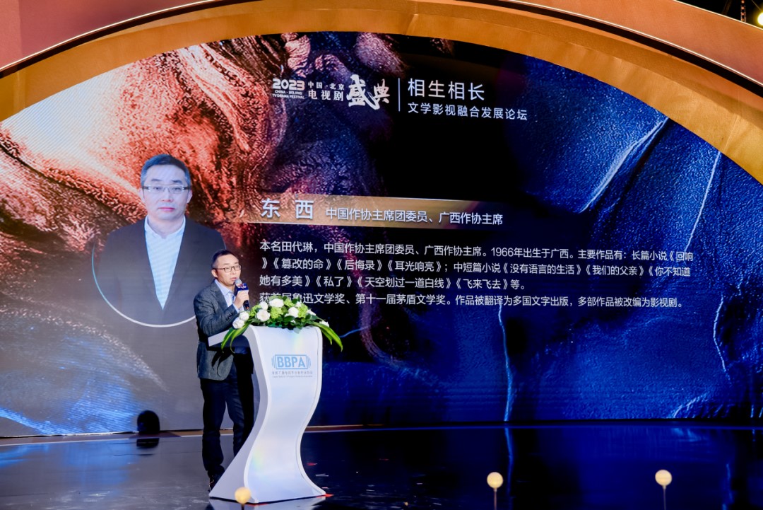 广西作家协会主席、第十届茅盾文学奖获得者东西,在论坛上发表《小说负责开疆拓土 影视负责做大做强》的主题演讲。作家东西称,小说改编为影视作品,必须确保小说创作的传统,即塑造人物、情节递进、逻辑严密、台词精彩等。好的影视作品提醒创作者必须保留写作的基本项,基本项是收视率的保证。如何做到小说和影视作品双赢?那就是小说负责开疆拓土,影视负责做大做强。