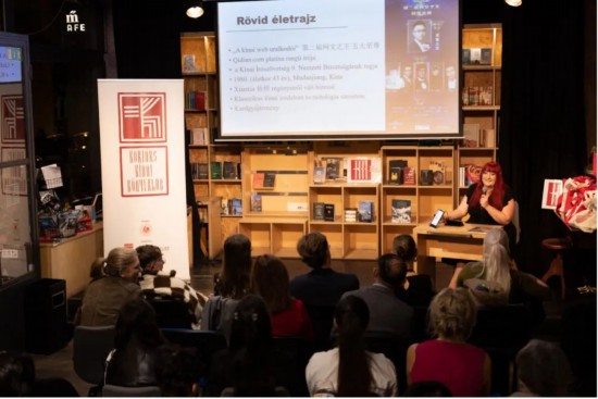 罗兰大学中文专业在读博士生祹络岚(Torma Laura)侃侃而谈,介绍了作家王蒙的处女作长篇小说《青春万岁》。来自帕兹玛尼·彼得天主教大学中文系的瑟普·巴林特(Szép Bálint)端着一小杯红酒随后登场,他从后现代、怪诞、讽刺和魔幻现实主义四个特点解析了莫言的长篇小说《酒国》。肯尼兹·扬卡(Kenéz Janka)和卓菲(Pádár Zsófia)分别推荐了苏童的短篇小说《游泳池》《樱桃》和长篇小说《米》。罗兰大学中文专业在读硕士生杨康(Megyeri Janka)介绍了耳根的“仙侠”三部曲——《一念永恒》《仙逆》和《三寸人间》,她站在比较文学的角度阐释了西方的魔法世界与东方的仙侠世界的异同。