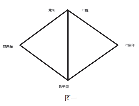 可以看出,《千里江山图》两条主要的情节线索,恰好形成了两组人物关系三角形,建构了极为工整的对位关系。在第一组人物关系三角形中,陈千里和易君年构成三角形的底边和底角,而顶角则是三年前在广州被杀害的龙冬;在第二组人物关系里,陈千里和叶启年作为底边和底角,则同样指向了顶角处在南京被枪杀的叶桃。在时间的维度上,两个三角形的结构,都是处在1933年的底边和底角,指向了1929年的顶角。巧合的是,叶桃被杀害前正在执行的任务,恰恰是从叶启年办公室的保险柜里,寻找中共广州地下组织被破坏的原因(也就是龙冬之死的真相)。这就使得两个三角形不仅分享着共同的底角——陈千里,而且深入到历史当中的两个顶角也紧密地勾连在一起(见图一)。