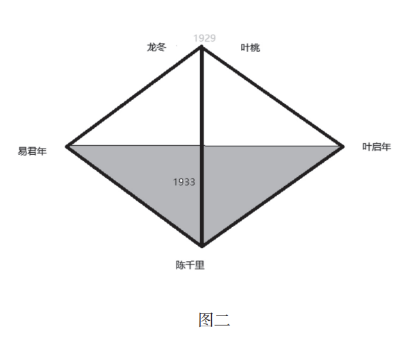 而如果电竞竞猜进一步引申的话,这里其实还存在着另一组人物关系三角形——叶启年、陈千里和易君年。20世纪20年代中期,还在大学任教的叶启年和大多数中国知识分子一样,也在思考富国强兵、振兴中华的道路。此时,叶启年正信奉无政府主义思想,并物色优秀的年轻人团结在自己身边。陈千里和易君年都是叶启年选中的青年学生,只不过在时代大潮的推动下,两个人选择了截然相反的人生道路。陈千里受到叶桃的影响,认识到叶启年的“虚无主义背后,躲着一个投机分子、野心家”[13],转而接受了共产主义思想;而易君年则不断追随导师叶启年,先是潜伏在中共广州地下组织内,行动成功后,继而利用龙冬的身份,打入中共上海地下组织。从这个角度看,这部小说的情节人物结构,也可以看作一个类似于三棱锥的立体结构,叶启年、陈千里和易君年在1933年初围绕“千里江山图”计划展开的对决,构成了这个三棱锥的底面;他们的行动最终都指向了历史(也就是三棱锥的顶点),即1929年死去的龙冬和叶桃(见图二)。