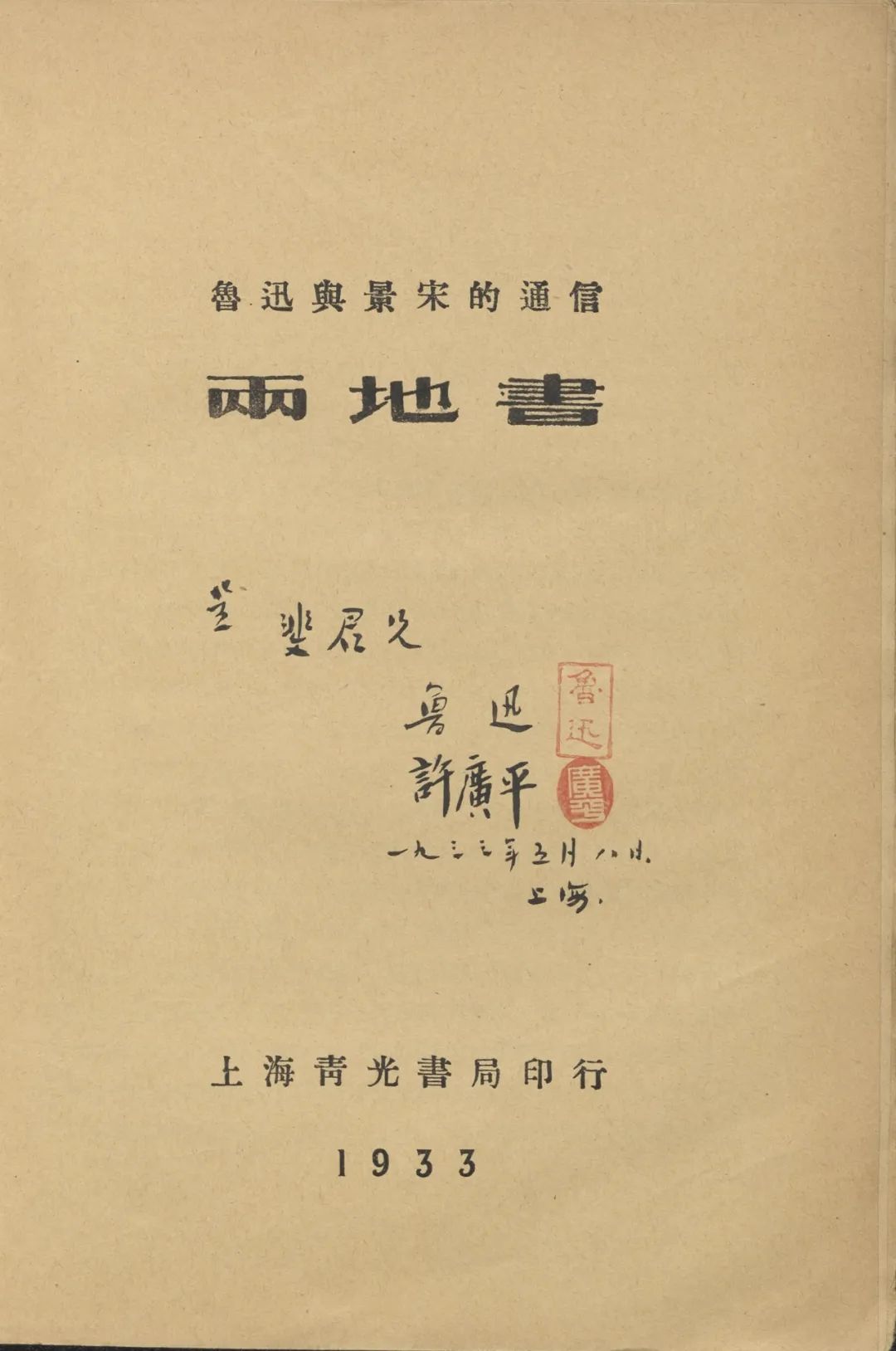 鲁迅、许广平题赠孙斐君《两地书》扉页(中国国家图书馆提供)