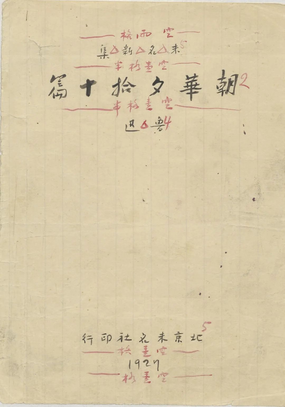 1.《朝花夕拾》现存所有手稿:包括2篇小引、1篇后记、7篇散文,另有目录和扉页(见插图)。《朝花夕拾》所收10篇回忆散文原以“旧事重提”为总题名发表于《莽原》半月刊,因此手稿中都有副标题“旧事重提之X”。这批手稿修改较多,目录、扉页、《小引》副稿都有鲁迅本人朱笔标注的排印格式。《二十四孝图》《五猖会》《无常》《父亲的病》《后记》等5种手稿都有红笔标格式字号等,是用于排印发表留下的痕迹。《朝花夕拾》稿件寄交韦素园、李霁野、台静农等,鲁迅去世后由李霁野交还许广平。