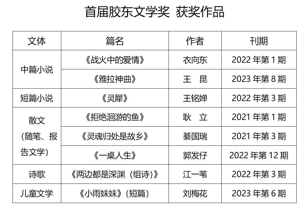 公示期间,如发现获奖作品有不符合《胶东文学奖评选办法》的情况,请向评奖办公室反映。