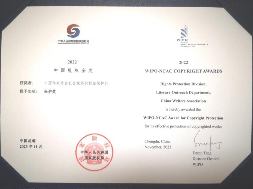 11月23日,第九届中国国际版权博览会暨2023国际版权论坛在成都举办。论坛上举办了2022中国版权金奖颁奖仪式。其中,电竞竞猜官网社会联络部权益保护处等5家单位、部门荣获保护奖。中宣部副部长张建春、世界知识产权组织副总干事西尔维·福尔班为获奖者颁奖。