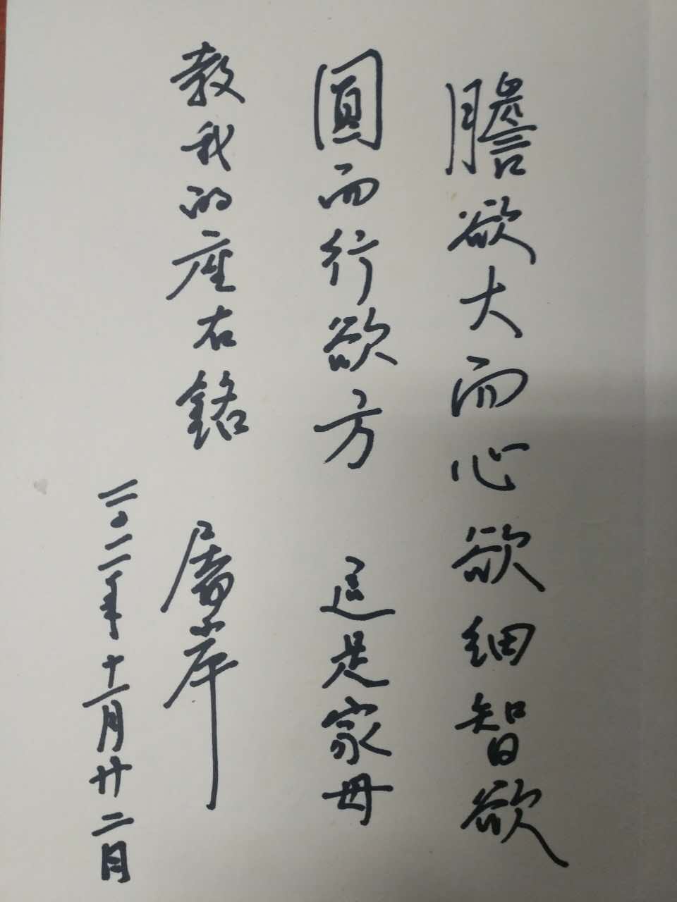 “胆欲大而心欲细智欲圆而行欲方 这是家母教我的座右铭 屠岸 二0一一年十一月二二日”
