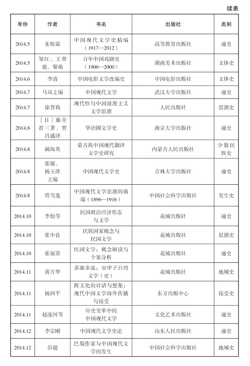 除此二者之外,还有一些情况需要略作解释。第一,总体来看,现代文学史与当代文学史在史观、问题意识等方面还是存在较大差别的,整理与分析当代文学史的工作超出了笔者的能力范围,本目录未收录单纯的当代文学史。第二,某些通史或地域史类著作,往往研究范围纵贯古代文学和现当代文学,如果其中现代文学部分所占比例或篇幅较大,也酌情收入。第三,对于在国外出版的著作,仅收入截至目前已有中文译本的,其余则不收入。第四,目录中所有著作均按出版时间先后排序,个别著作只知出版年份,具体月份不详,则列在该年末尾;凡有多个版本的著作,均只列为一个条目,并按初版时间排序。依此原则,本目录中只收近十年来首次出版的著作,近十年间再版的史著概不收入。