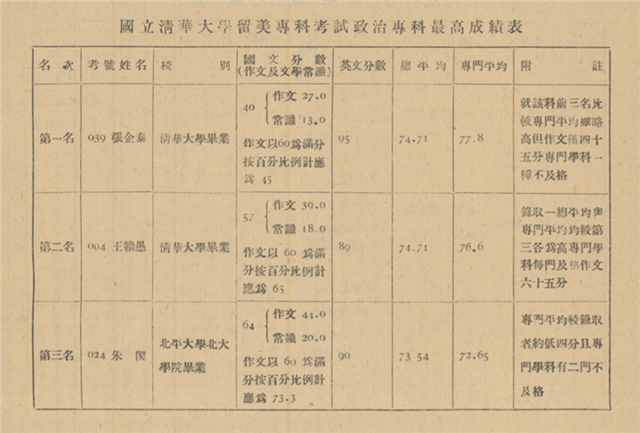 国立清华大学留美专科考试政治专科最高成绩表