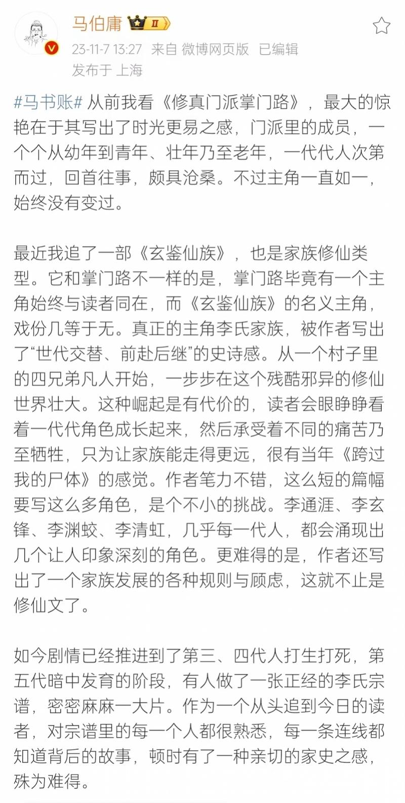 著名作家马伯庸也是《玄鉴仙族》的读者,对《玄鉴仙族》的群像写法拍案惊赞。他认为,书中的李氏家族被作者写出了“世代交替、前赴后继”的史诗感。“从一个村子里的四兄弟凡人开始,一步步在这个残酷邪异的修仙世界壮大。这种崛起是有代价的,读者会眼睁睁看着一代代角色成长起来,然后承受着不同的痛苦乃至牺牲,只为让家族走得更远。”