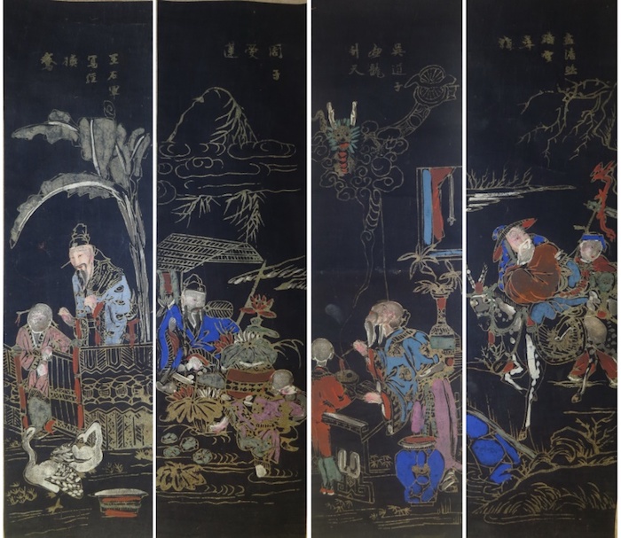 另外,传统年画中还有一种适用在书房或客厅张贴的条屏年画,其内容多表达文人崇尚的精神内涵。传统木版年画的大量印制,会将这种文人偏好影响到老百姓的生活中,使年画发挥其社会教育意义。清代杨柳青年画“四爱图”(见图4),是其中最具代表的一类文人年画。这类年画以小三裁条屏式画幅形式,其黑色画地、金线印制为清代时期收复新疆后销往维吾尔族地区的一类独特产品。四爱图包含了“王羲之爱鹅”“周敦颐爱莲”“吴道子爱龙”“孟浩然爱梅”四个文人的历史故事,年画中吴道子画龙升天,“神龙见首不见尾”的表现力,让观者大为惊叹。