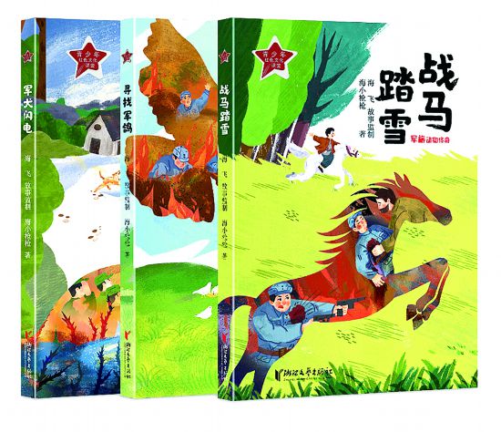 在海小枪枪“军旅动物传奇”系列儿童小说作品中,作者着眼于孩子与动物之间的深厚情谊,以抗战作为背景,创作了《战马踏雪》《寻找军鸽》《军犬闪电》等几部儿童文学作品。