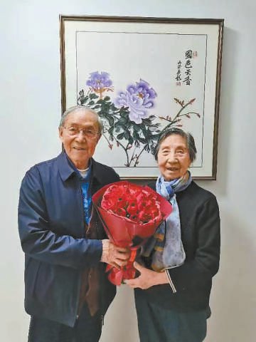 2024年新年,束沛德与夫人手捧文友赠送的鲜花,合影留念。
