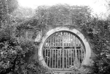 从老街拐进短巷进去不过二十几米,是一个杂乱的大杂院,像是兵荒马乱仓促出逃后留下的一片狼藉。向左拐,赫然看到一座园门,常见的园林月洞门,只是两边墙上及门上全都爬满着爬藤植物,木本植物恣意疯长,台阶上生着杂草和苔藓,圆形门洞里的镂空铁门上突兀地倚着一个大扫帚。园门上方和左手墙上隐约有雕刻的文字,可惜全被植物覆盖了。