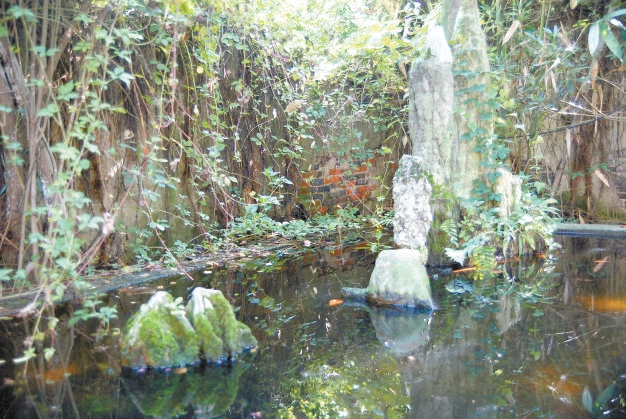 戴明新女士上前去开门,脚步轻盈表情却并不轻松,甚至说有点沉重了。走进园子可见满目荒凉,不少地方的建筑构件已经倾圮,有的地方则被拆除。园池失修,破落斑驳,池水发黑。地面上则全被落叶、杂草、苔藓和蘑菇菌类占领了。细看花坛、石雕、铺地、山石等,仍不失精致。