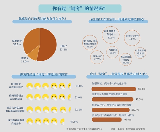 近日,《中国青年报》公布的一份社会调查问卷结果显示,在1333名受访青年中,53.3%的受访者感觉近几年自己的语言文字表达能力下降,47.1%的受访者感觉自己词汇量匮乏、表达单一。年轻人“词穷”的问题不容小觑,“词穷”显示的是年轻人表达能力的弱化,这不仅会影响人际交往,也不利于以后的职业发展。为此,本报特采访多位年轻人,就此问题进行深入观察。