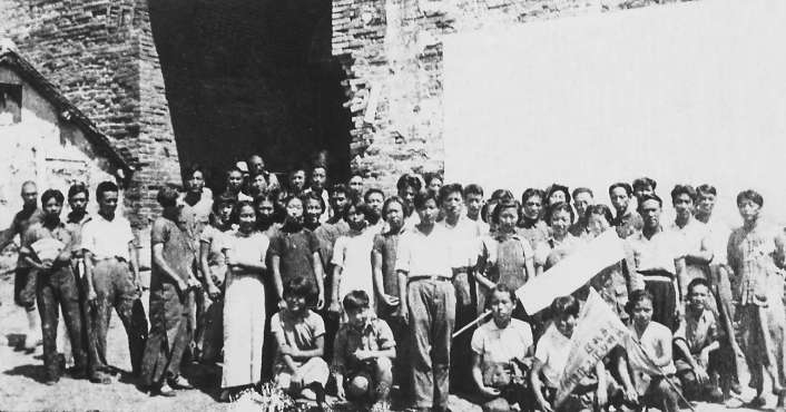 1938年,臧克家率领的第五战区战时文化工作团与河南“战教团”联合演出后合影。站立者右六为臧克家。