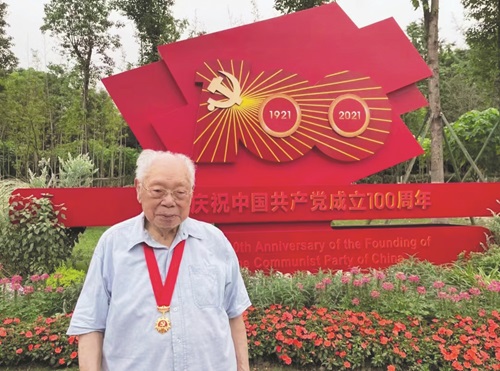 2021年,马识途在中国共产党成立100周年展示牌前留念
