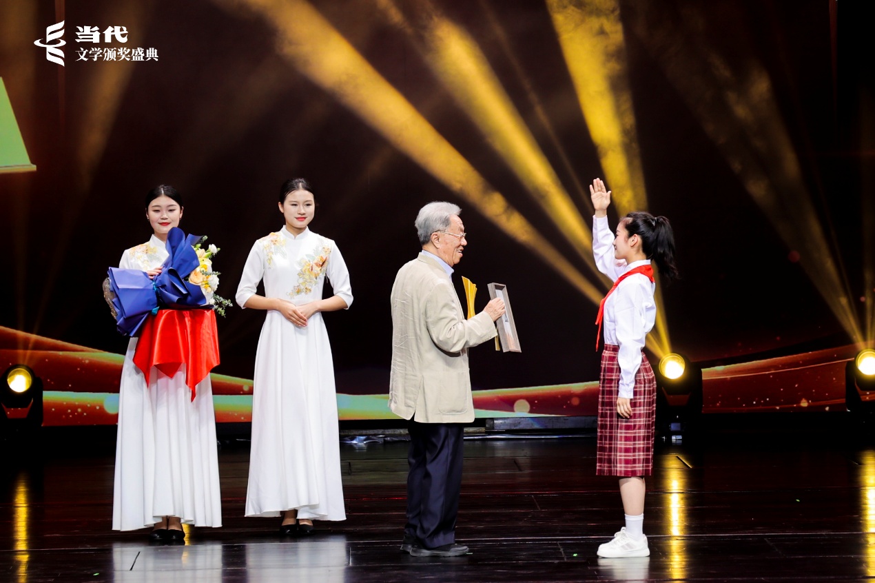 郑州外国语中学八年级学生作为青少年代表为王蒙先生送上奖杯与证书,现场观众共同见证“少年致敬长者、白发嘱托少年”的动人场景