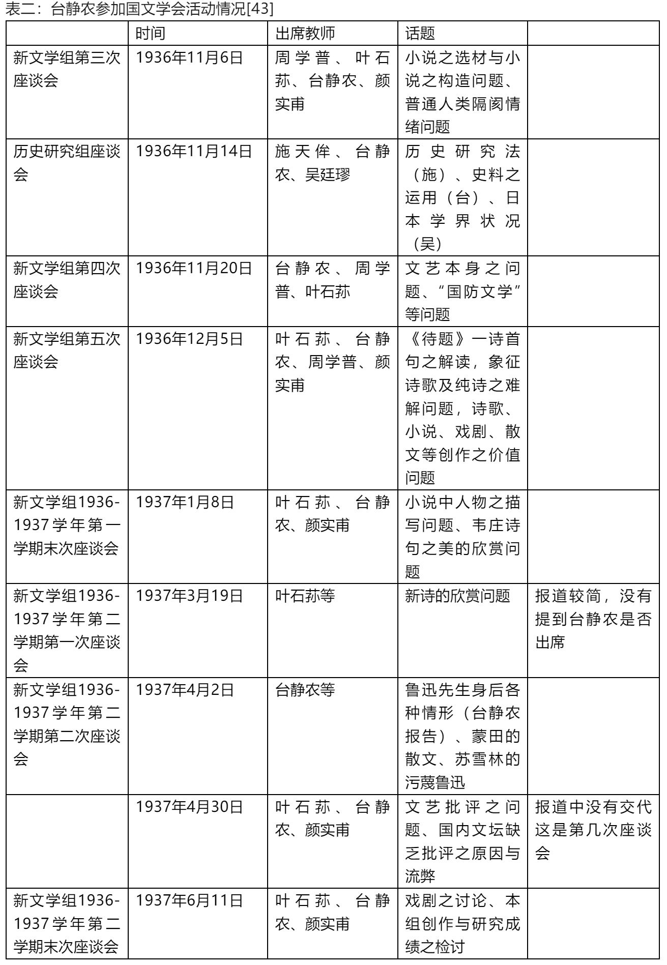 如前文所述,对古典之学的重视,是当时大学中文系的一般情形。台静农这里古今之间不分轩轾的方案,从何说起?原因肯定是多方面的。但一个可以认定的事实是,出于首任校长杨振声的教育理念,国立青岛大学及其后身国立山东大学,一直在实践着打通古今的学程设计[75];就其任职一年的课内外活动而言,台静农对这一点是有切身体会的[76]。说这对他的相关思考有一些影响,当非无根之谈。[77]至于强调中国文学系与外国文学系等的课程沟通,也与青岛大学/山东大学的情况若合符节[78]。外国文学系的叶石荪本来就在中国文学系开课[79]。而作为一种“惯例”,当年新文学会座谈会上台静农和叶、颜的共同出席,不仅奠定了他们深厚的友谊,更让人感觉他们跨越了中外文学系的界限。[80]