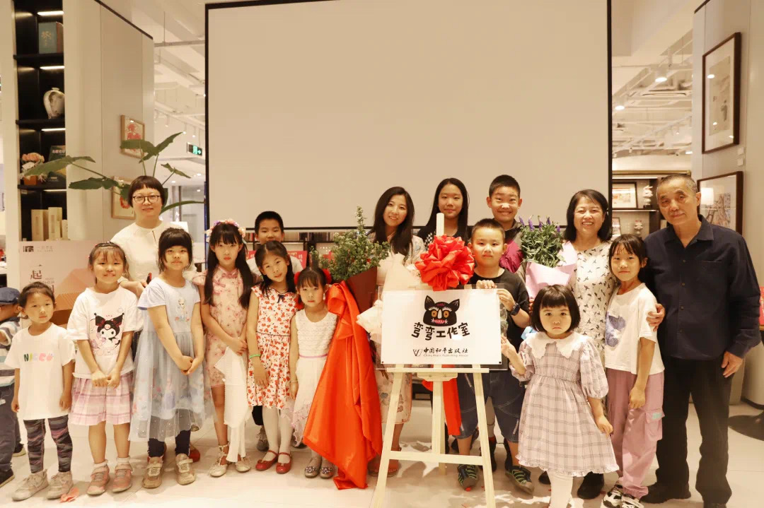 最后,北京航空航天大学新媒体艺术与设计学院教授颜新元为作者献花,并与刘雪纯、弯弯以及小朋友们一起为“弯弯工作室”揭幕。