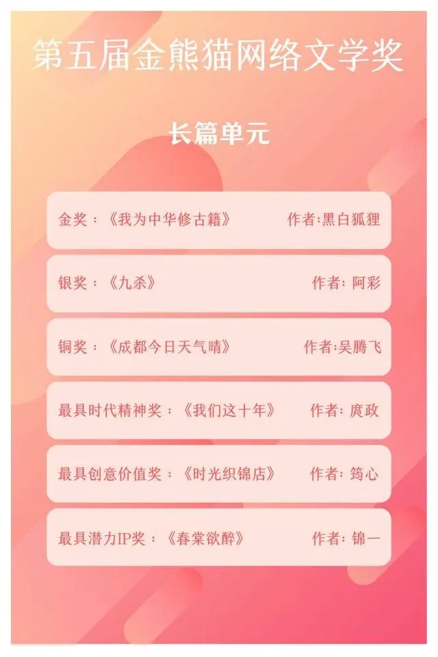 封面新闻记者从主办方获悉,“金熊猫” 网络文学奖设立于2016年。作为四川省首个网络文学行业奖项,目前已成功举办五届的“金熊猫”网络文学奖在全国范围内已具有行业知名度和影响力,不仅有效挖掘出一批极具潜力的网络作家及作品、鼓励培育了若干具有时代特色、蕴含文化内涵的优秀IP,并且为激发网络文学创作活力、促进网络文学繁荣发展、塑造网络文化品牌发挥了重要作用,比如第四届的《天下藏局》《孤城记》等金奖作品就已具有影响力。