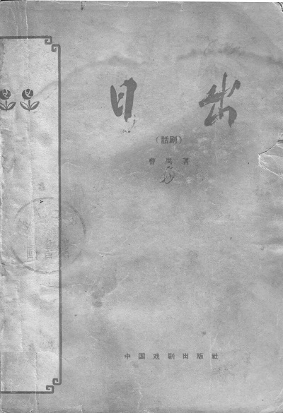 中国戏剧出版社的单行本《日出》,1957年9月第1版第1次印刷,印数为0001—9000册;1958年2月第1版第2印,印数为9001—14000册;1959年4月第1版第3印,印数为14001—17500册。这三次印刷,封面设计一致。底色为浅黄色细网纹,书名写作黑色,位于封面左上方,书名下有中国戏剧出版社的社标,书名上方有“五四以来话剧剧本选”字样。至第1版第4印,印数为17501—27500册。这一印封面设计大不相同,取消了原封面上“五四以来话剧剧本选”字样和社标,同时底色改为浅绿色,书名作深绿色,靠近书脊处留有两指宽的白边,边框为简化祥云纹,白边上部并排印两朵红色小花。