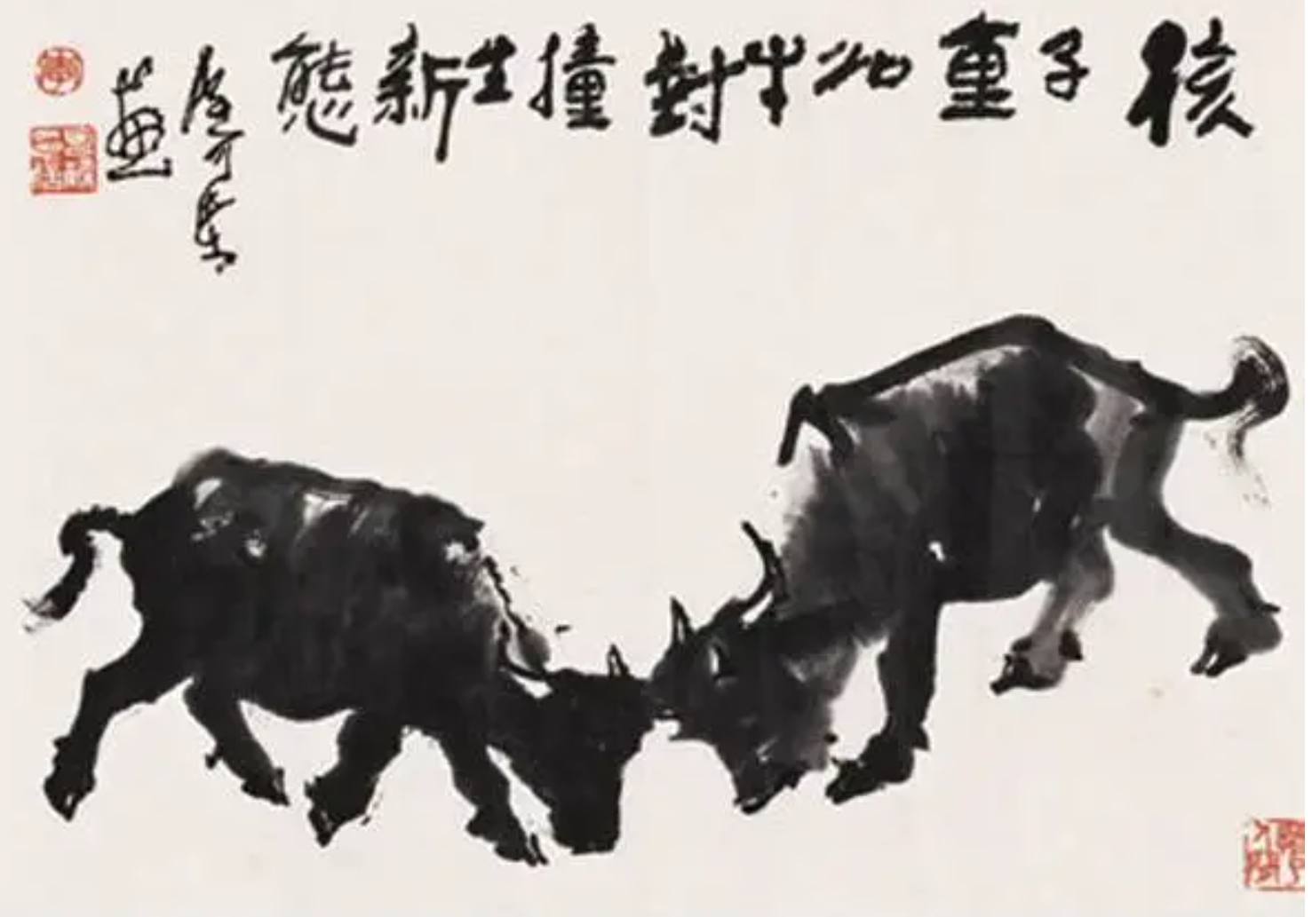 1989年5月,中国高等科学技术中心召开《场、弦和量子引力》国际学术研讨会,李政道邀请到了李可染作主题画,李可染画出了一幅《超弦生万象》,后来在1989年6月,又为《相对论性重离子碰撞》国际学术研讨会,画出了一幅《核子重如牛,对撞生新态》,画的是两头壮实的公牛肌肉紧绷,拼出了所有力气,低头对撞。李可染先生曾经画遍了层林尽染,满山红遍,表现出无限风光尽收眼底的潇洒与展括,但在画完这幅双牛对撞之后,却是气喘吁吁,连说太累了,太累了。他是在牛的对撞之间,感受到巨大而又猛烈的风驰电掣千钧之力。正负电子就像两匹高速奔跑的牛,死命地撞向对方,二者相遇的一刹那,如电闪雷鸣,火花四溅,就在这些像焰火一般四射的碎片中,科学家从中捕捉到可能从未发现过的物质。