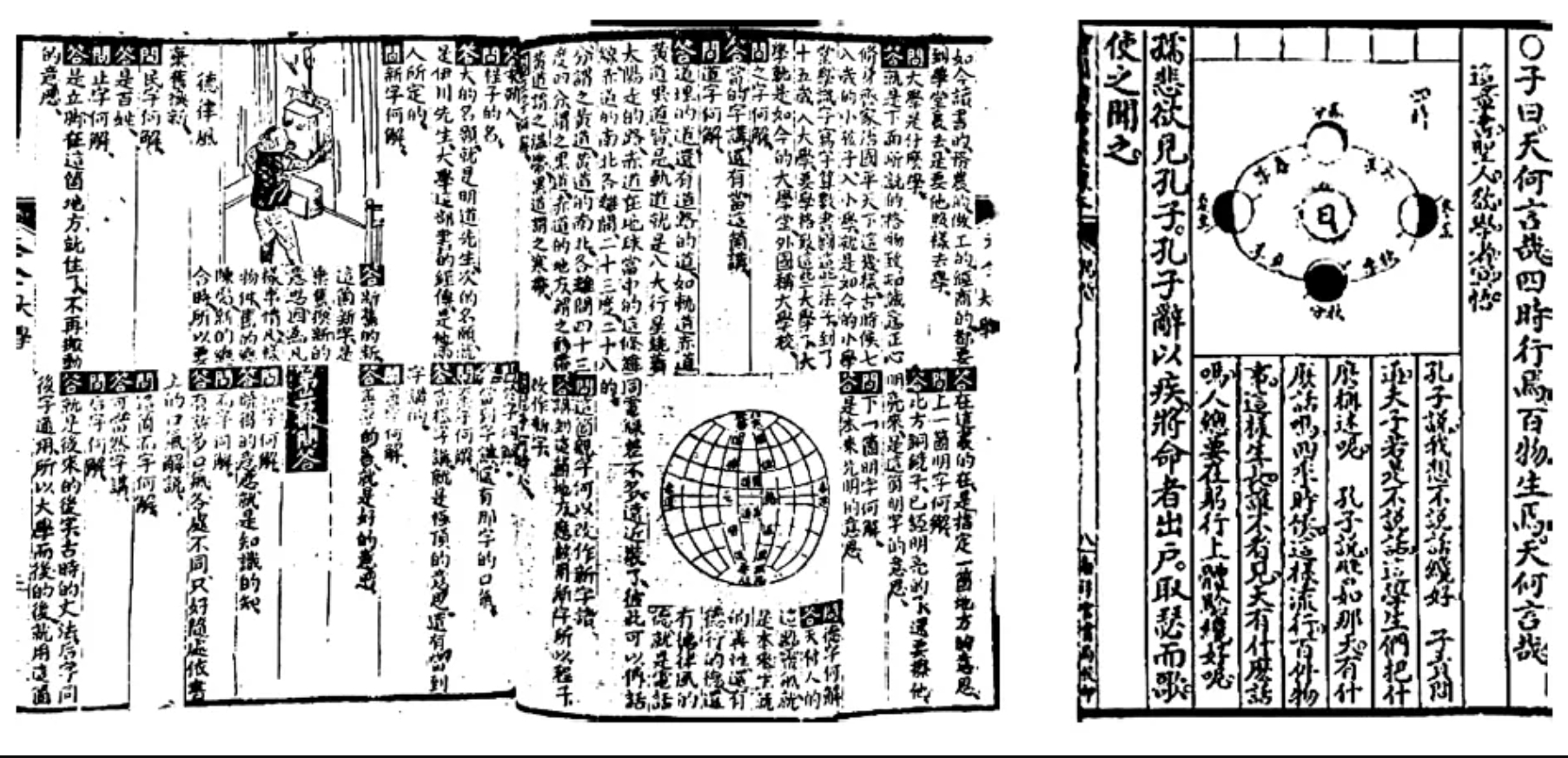 此外,彪蒙读本还常在训解字义时牵扯与经书原文毫不相关的新事物,仅凭字面雷同就将经文附会于“外国政治艺学”,配以清末石印读物中常见的“西洋景”图像,堪称近代经训书中的一朵奇葩。如解“大学之道在明明德”,由“道”字讲到“赤道”“黑道”“黄道”而配一赤道图,又由“德”字联想到“德律风”(电话的旧译)而配一打电话图(如图1左)。此外,如解“表里精粗”之“表”,则绘一寒暑表;训“忠信重禄”之“重”,则罗列重学试验器皿;论“巧言令色”如留声机,则配一西人留声机器图——“诸如此类,触目皆是”,引起保守者激烈反弹。该书先是被广东提学使斥为“去圣之言不知几千万里”,旋又与彪蒙书室所出其他教科书一起遭到学部厉禁。尽管如此,直到光宣之际《绘图四书速成新体读本》仍颇盛行,据说“销行二十余版,各地小学都采作课本”,坊间翻印本则多改题《四书问答》以避锋芒。彪蒙书室亦迅速改窜原书,保留较为平实的白话译文,模仿经注体系于经文句下,删去较为激进的“问答”部分,以《图画四书白话解》的新书名重出江湖,一直行销至民国以后。