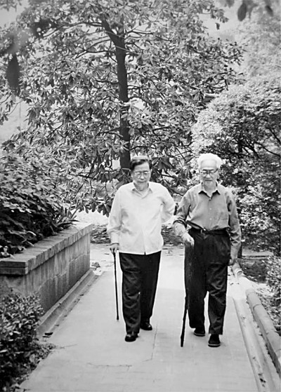 1980年,巴金(右)与曹禺在巴金寓所散步