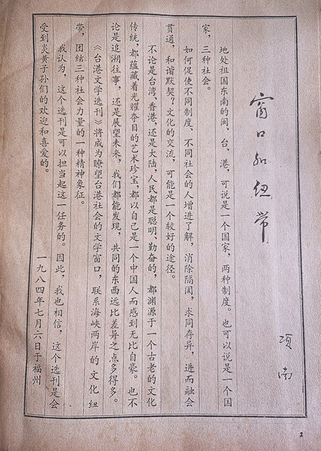 永远铭记于心的是,1984年7月6日,时任福建省委书记项南为《台港文学选刊》撰写了代发刊词《窗口和纽带》,言简意赅地阐明了《台港文学选刊》的性质、意义和作用。他指出:“如何促使不同制度、不同社会的人增进了解,消除隔阂,求同存异,进而融会贯通,和谐默契?文化的交流,可能是一个较好的途径。”他期待,“《台港文学选刊》将成为瞭望台港社会的文学窗口,联系海峡两岸的文化纽带,团结三种社会力量的一种精神象征”,“这个选刊是可以担当起这一任务的。因此,我也相信,这个选刊是会受到炎黄子孙们的欢迎和喜爱的”。