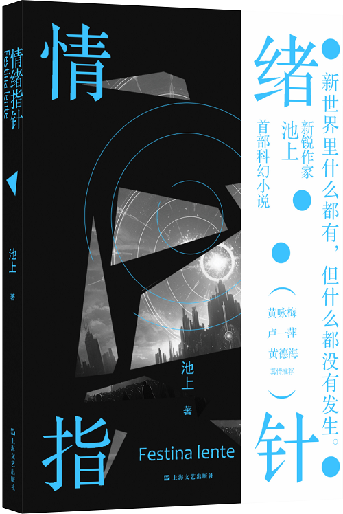 《情绪指针》是池上首部长篇科幻小说,科技发展到了超前高度的未来,出现了名为“大灾变”的集体自杀事件,勒弥由此创建了基遍国。为避免人类的负面情感让文明重蹈覆辙,基遍取消了家庭这种最基本的社会生活单位,并通过植入情绪指针保证人类情绪的绝对稳定。劳宇供职于基遍的秘密部门“海葵”,负责清理过去社交媒体上遗留的情绪垃圾,随着部门元老宋明朗的失踪,他稳定的生活开始发生变化,劳宇渐渐发现“大灾变”和情绪指针都是勒弥欺骗人类的手段,而他实际上是“零度情绪人”的研究蓝本。
