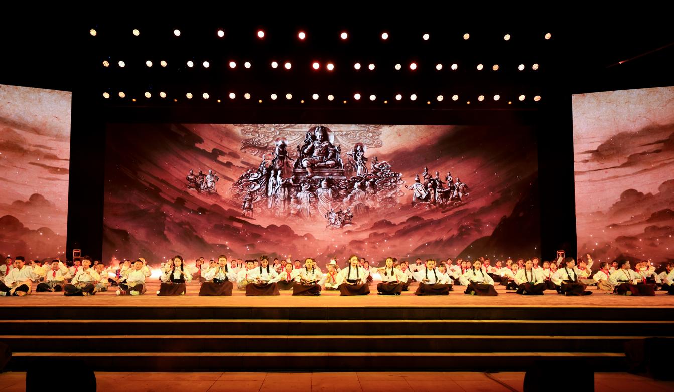 音乐剧演出现场,德格县中小学校的学生登场,共同演绎了一场英雄史诗《格萨尔王传》百人说唱。一个个稚嫩的面庞,代表着未来的希望。据德格县委常委、宣传部部长泽仁卓嘎介绍,近些年,德格县持续开展“非遗进校园”活动,打造非遗项目特色专业课程,培育非遗项目特色人才。截至目前,这一活动已覆盖5000多名学生,培育了无数有潜力的未来传承人。