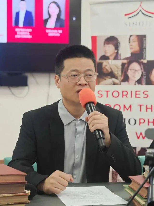 活动当天,作家横扫天涯在现场发言。(中国驻英国使馆文化处供图)