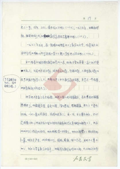 面对着这部手稿,笔者好像看到一位63岁的老人是怀着怎样的激情在稿纸上进行着创作。这位老人是多么希望用自己手中的笔热情地讴歌陈景润——这位“可爱的数学家”。
