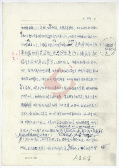 该稿共43页,作者用蓝黑墨水在“人民文学15X16=240”的稿纸上进行创作。每张手稿右上角均有页码标识,其中包括第1-37页,第39-44页。不知什么原因,该稿并没有第38页。经笔者细读,并与《人民文学》上发表的《哥德巴赫猜想》对照,发现该稿第37页与第39页的内容前后连贯,很有可能是作者将第38页错标为第39页。
