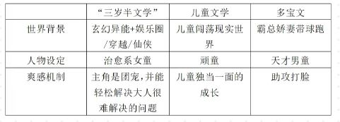 表1“三岁半文学”与儿童文学、多宝文的对比图