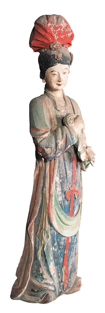 圣母殿内完整保存了43尊彩绘泥塑。圣母邑姜像头戴凤冠,霞帔珠缨,端庄高贵。42尊侍从像对称分列于圣母神龛两侧,有的奉文印翰墨,有的洒扫梳妆、奏乐歌舞。这组塑像写实传神,对研究宋代宫廷生活、衣冠服饰和彩塑艺术具有重要价值。