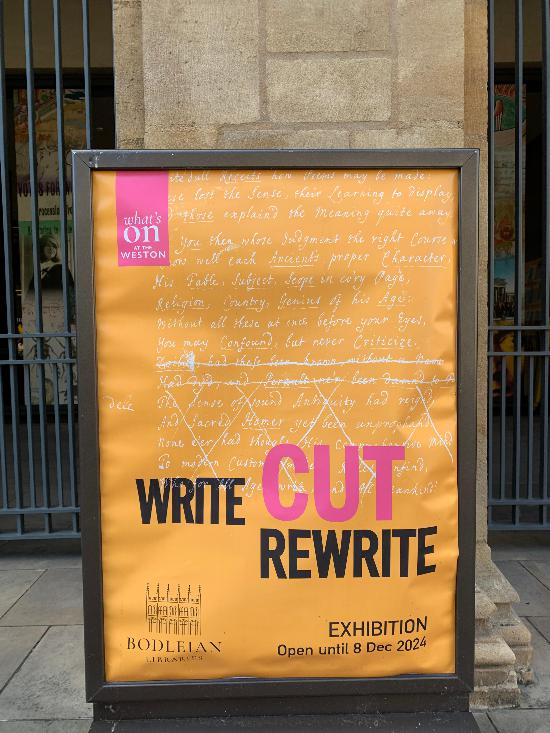 整个展览由牛津大学书志学和现代书籍史教授德克·范·赫尔(Dirk Van Hulle)与雷丁大学现代文学和贝克特研究教授马克·尼克松(Mark Nixon)策划,入口处的海报用大号字体印着斯蒂芬·金的一段写作箴言:“杀死你的宠儿,即使这会击碎你那颗三流作家的自尊心,杀死你的宠儿。”(Kill your darlings, even when it breaks your egocentric little scribbler’s heart, kill your darlings)右侧墙上挂着一个三层书柜,最上面是本次展览的图录,下两层则是展览中涉及的图书,以供参观者浏览对照手稿和出版成书之间的差别。展品覆盖的时段很长,从中世纪直到当下,可谓琳琅满目,包括十二世纪奥古斯丁会修士奥尔姆(Orm)的圣经评注《奥尔姆之镜》(Ormulum),作曲家巴赫在莱比锡时反复涂改的康塔塔乐谱,十八世纪英国小说家简·奥斯丁未完成的小说《沃森一家》(The Watsons)、1816年夏天诗人雪莱游览日内瓦湖时的绘画速写和风景描写(其中一段被他的妻子玛丽·雪莱借用到《弗兰肯斯坦》中),现代主义大家乔伊斯、艾略特和贝克特的手稿,1974年旅行作家布鲁斯·查特文(Bruce Chatwin)记录南美洲之旅的Moleskine笔记本(上面记录了他创作《巴塔哥尼亚高原上》的素材),一直到史上被选为牛津大学诗歌教授(Oxford Professor of Poetry,2019-2023)的首位女诗人爱丽丝·奥斯瓦尔德(Alice Oswald)画满抽象画的创作本。尽管我刻意加快速度,短短一个多小时还是不够用,后来又找时间去看了一次,才算是“走马观花”扫了一圈。虽然展出的不乏上面这些文学史上赫赫有名的人物,整个展览逛下来,我觉得最有意思的却是以侦探和间谍小说知名的两位“流行文学”作家:雷蒙德·钱德勒和约翰·勒卡雷。