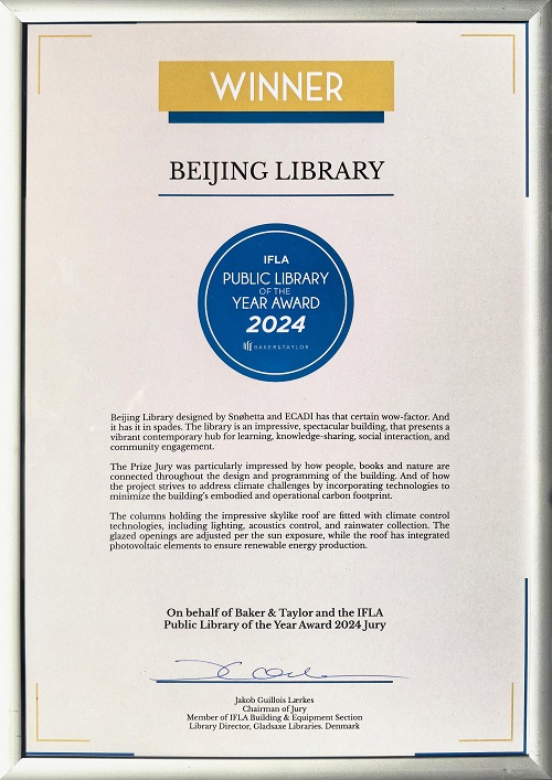 北京城市图书馆荣获国际图联(IFLA)2024年度公共图书馆奖
