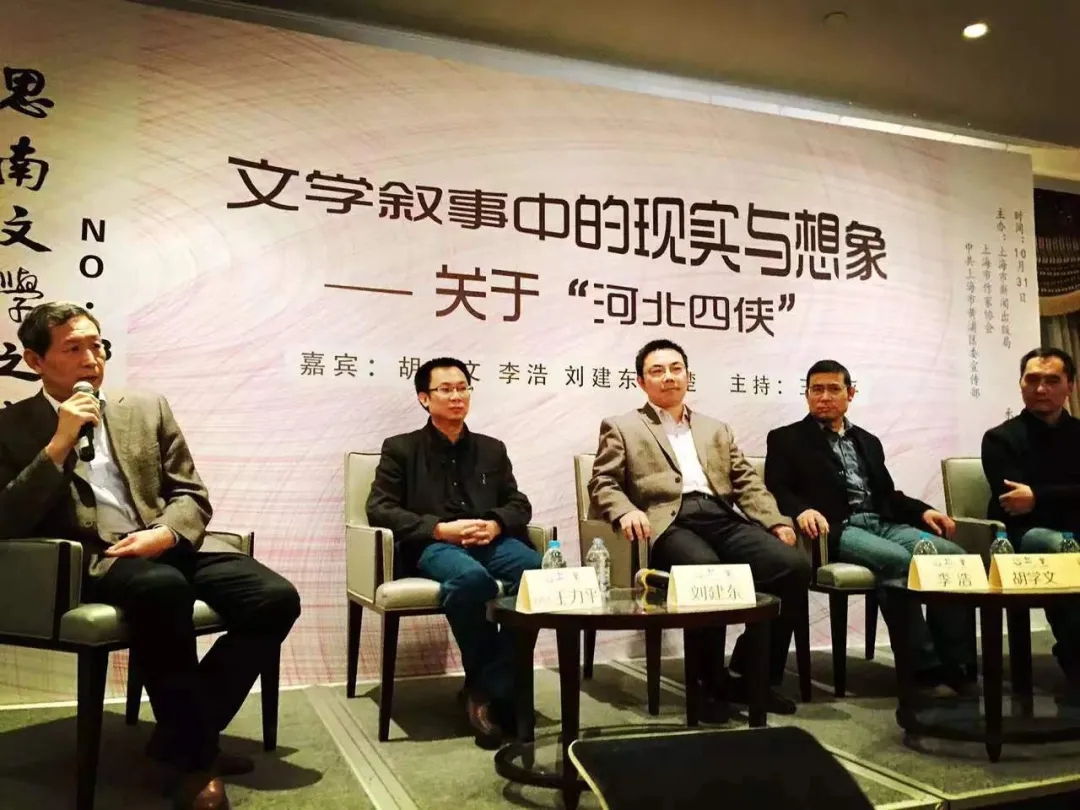 2015年10月,在上海思南文学之家主持“文学叙事中的现实与想象”(左起:王力平、刘建东、李浩、胡学文、张楚)