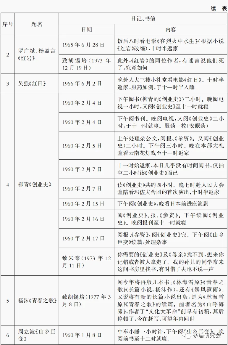 在日记中,茅盾观看了《红旗谱》话剧,以及电影《红岩》《红日》《林海雪原》,关于这些作品文本的阅读则淹没在了日记中“阅书”“阅书刊”之中。