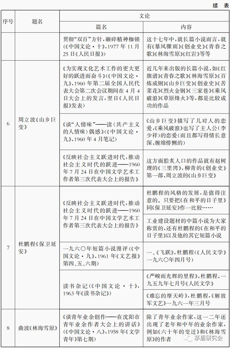 由表4可知,关于《红岩》的提及是最少的,梁斌《红旗谱》则较为频繁,在一次报告中三次提及,关于曲波《林海雪原》提及时间跨度最长,最早在1958的《谈青年业余创作——在沈阳市青年业余作者大会上的讲话》(《中国文论·八》,1958年《文学青年》第七期),最晚为1977年的《贯彻“双百”方针,砸碎精神枷锁》(《中国文论·十》,1977年11月25日《人民日报》)。